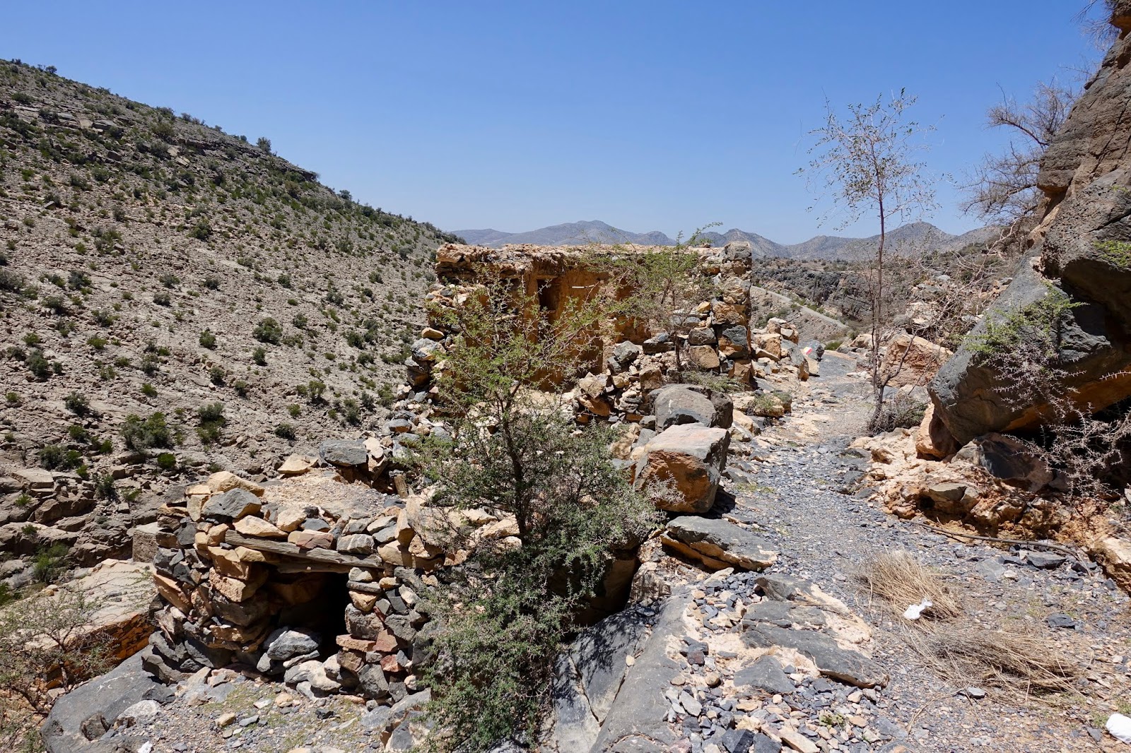 Some of the buildings are amazingly complex with several floors, nested into one another and interconnected by staircases and tunnels. Return via a loop trough the orchards encountering pomegranate trees, grapevines and even giant walnut trees – at least by Omani standards. In case you are still in an adventurous mood, there is a path towards another abandoned village, the one of As Sab …