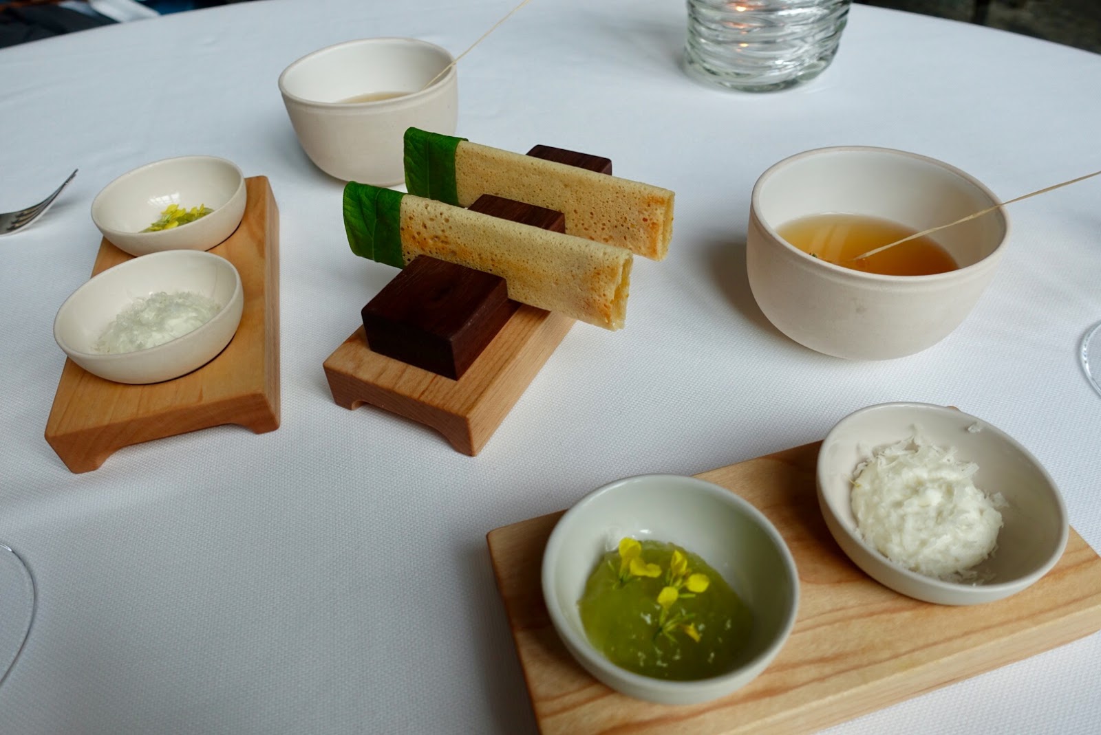 The first proper course was a dish inspired by Daniel Humm’s recent trip to India, a Tomato Dosa. The crispy, savory pancake was filled with goat cheese and green tomato and accompanied by a tomato tea with a summer herb bundle in it.